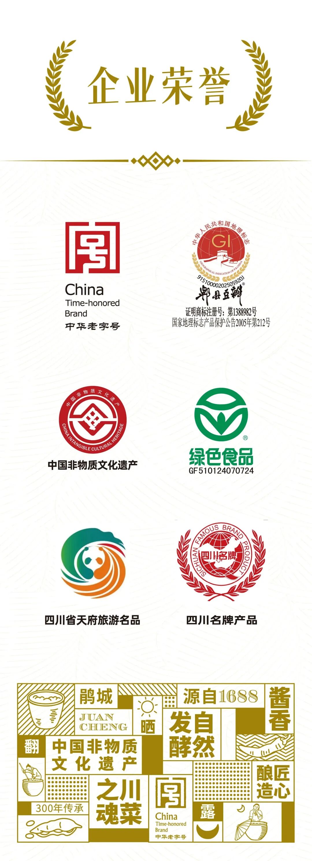 2009年,公司经批准使用"郫县豆瓣"地理标志证明商标,先后通过了ISO9001质量体系、“全国轻工业优质产品”“国家A级绿色食品”“中国国际农业博览会名牌产品”“全国食品工业企业诚信体系建设试点企业”等认证,获“中华老字号”“中国非物质文化遗产”及“中国食品工业优质龙头食品企业”“四川省农业产业化经营重点龙头企业”“四川省调味品十强品牌企业”“四川省农产品加工业示范企业”等荣誉。