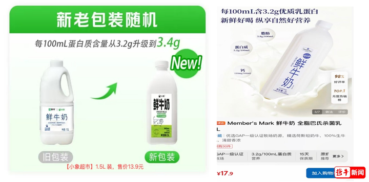 山姆自有品牌鲜牛奶和小象超市的同款鲜奶,供应商都是蒙牛,蛋白质含量都是3.2g/100ml,保质期同为15天,山姆单价高出近20%